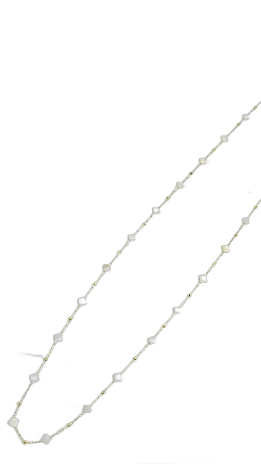 Colar 1v. comprido de corr. dourada com trevos de madreperola